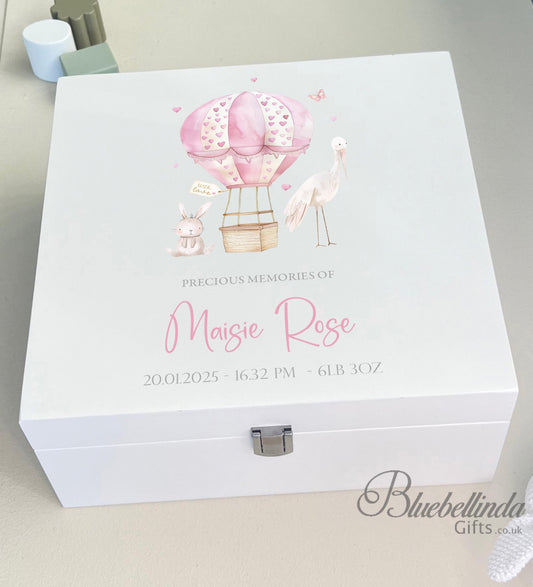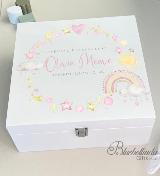 24 Luxury Personalised Baby Keepsake Memory Box, pink Design, Baby box, Wooden Box, New Baby Gift, Birth Stats, Bluebellinda Gifts