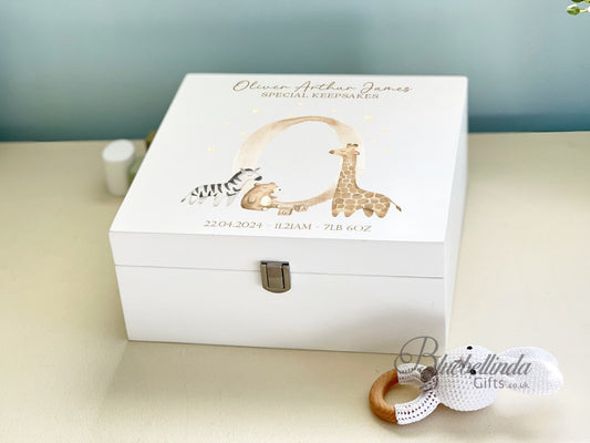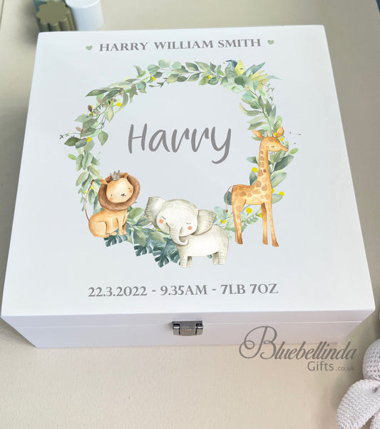 Luxury Personalised Baby Keepsake Memory Box, Safari Elephant Lion Giraffe Design, Baby box, Wooden Box, Birth Stats