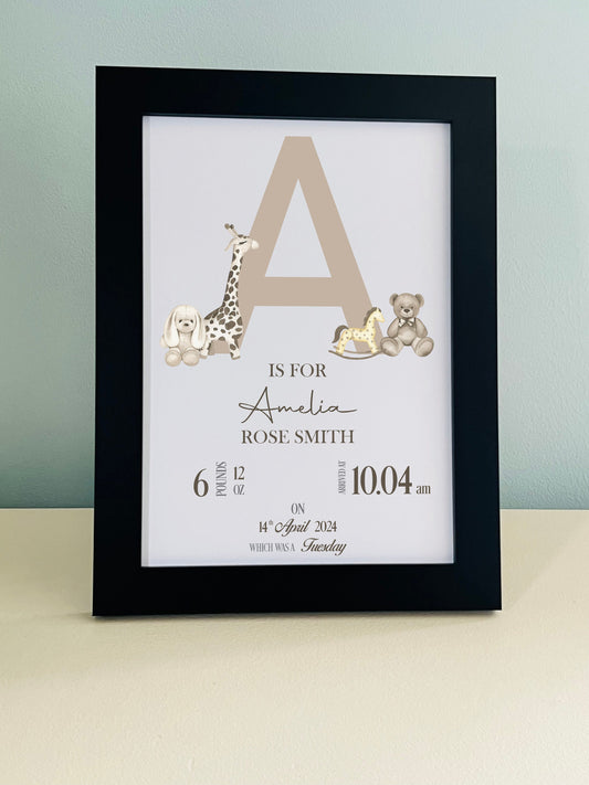 Personalised Baby Gift - Personalised Baby Print Brown Initial Bear Animals Picture White Frame Print - Newborn Keepsake - bluebellindagifts