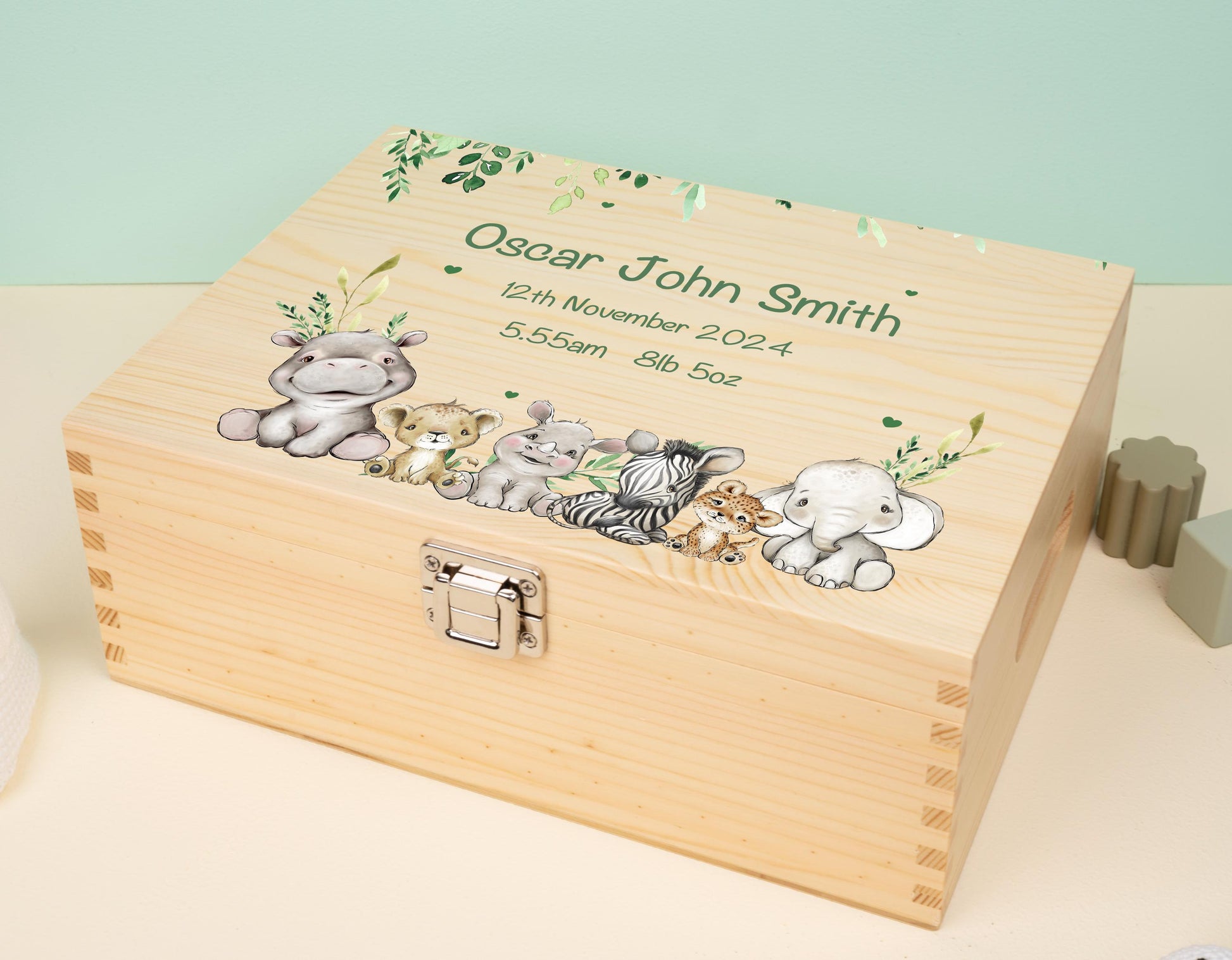 Our baby keepsake box with a timeless Green Safari Animal Leaves design, personalised with your child's name and birth details.