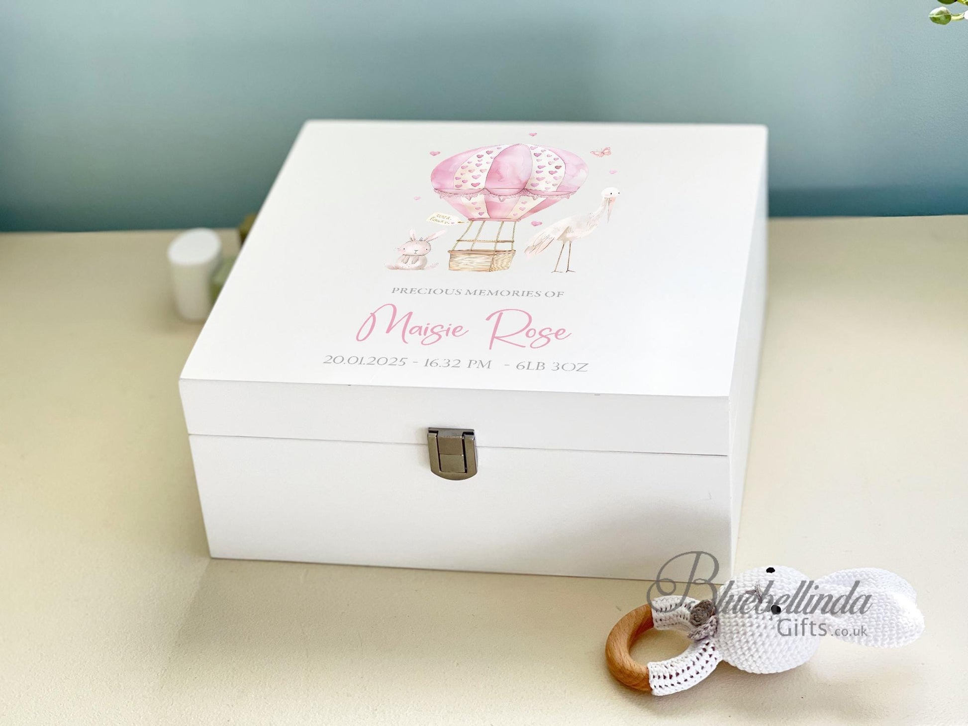 Our luxury baby keepsake box with a pink Design, personalised with your child's name and birth details.