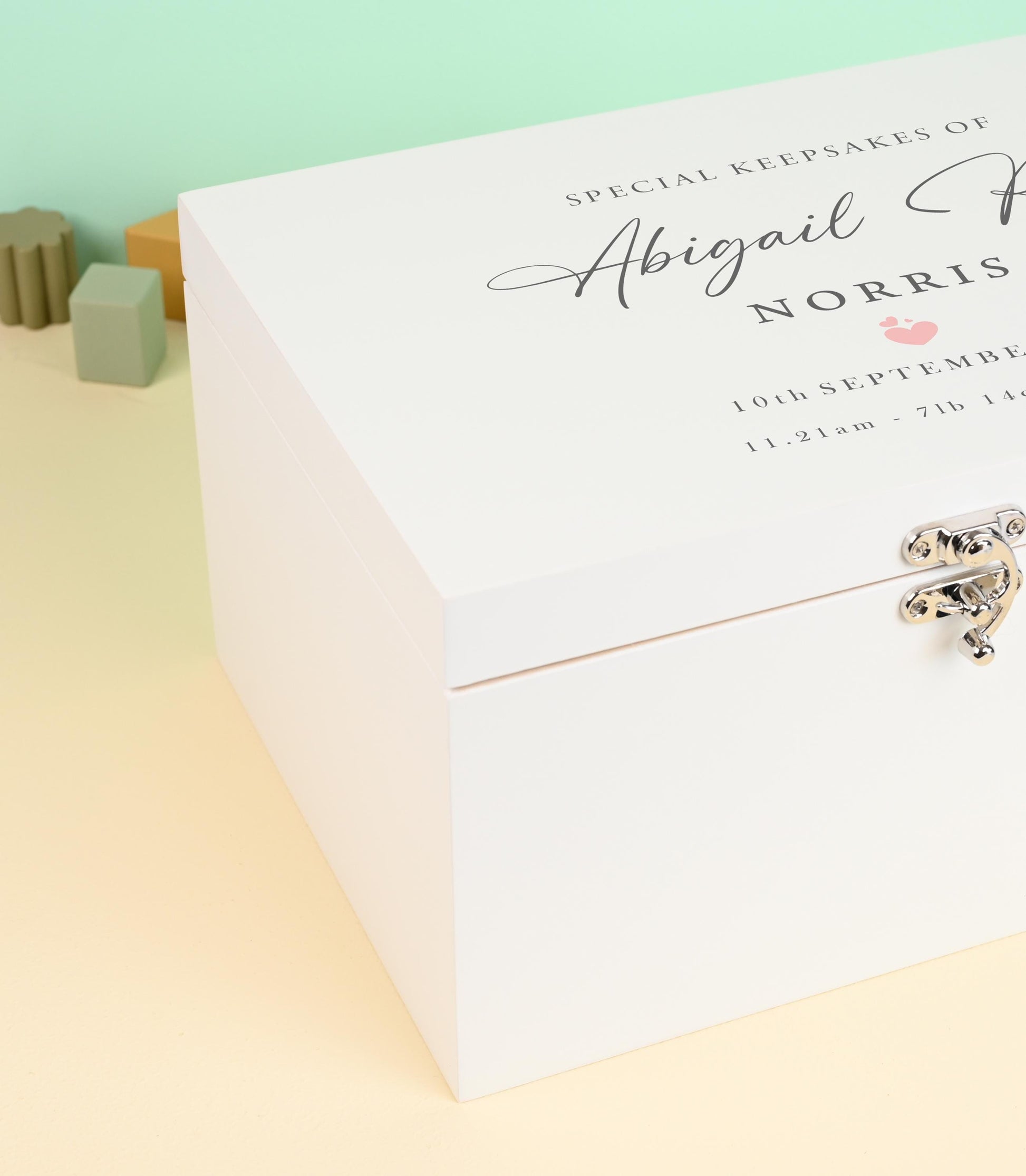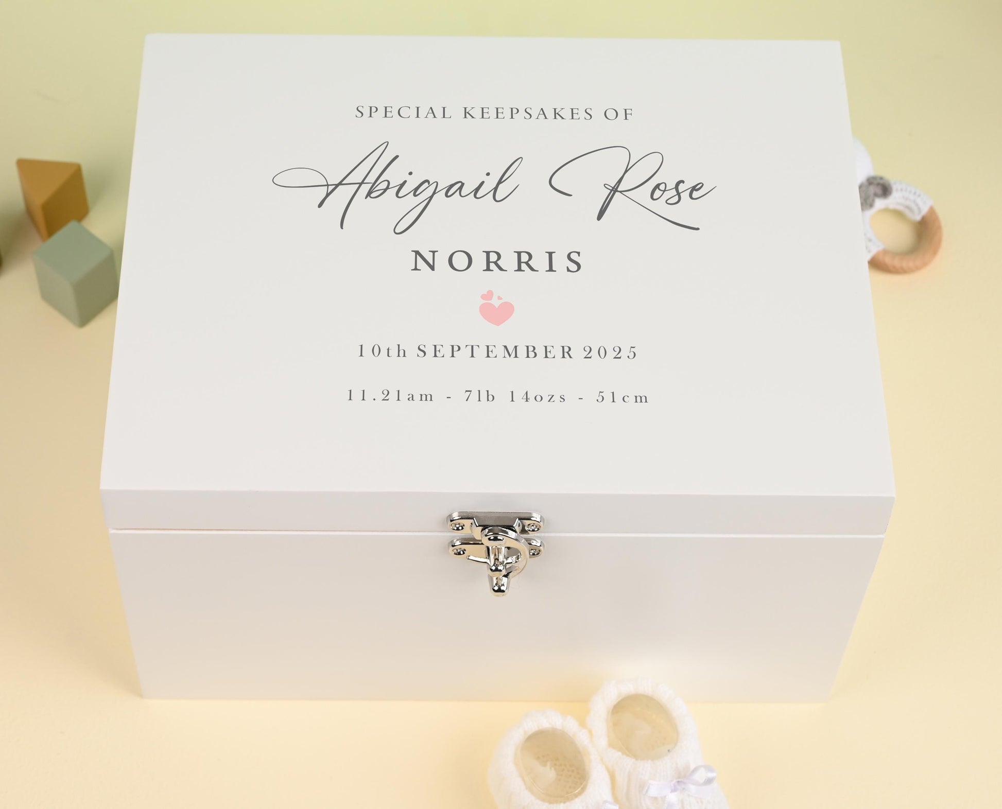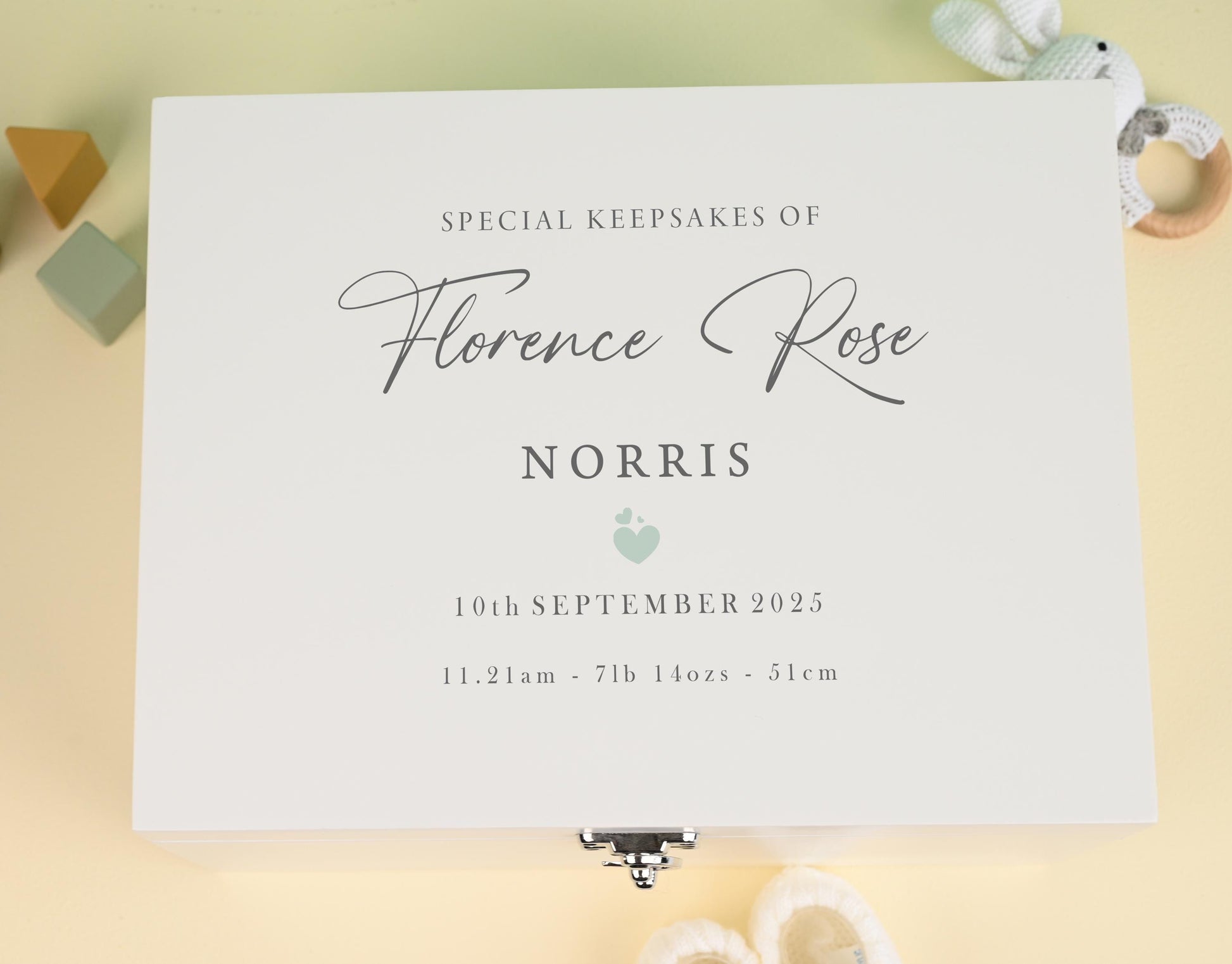 Our baby keepsake box with a timeless design, personalised with your child's name and birth details.