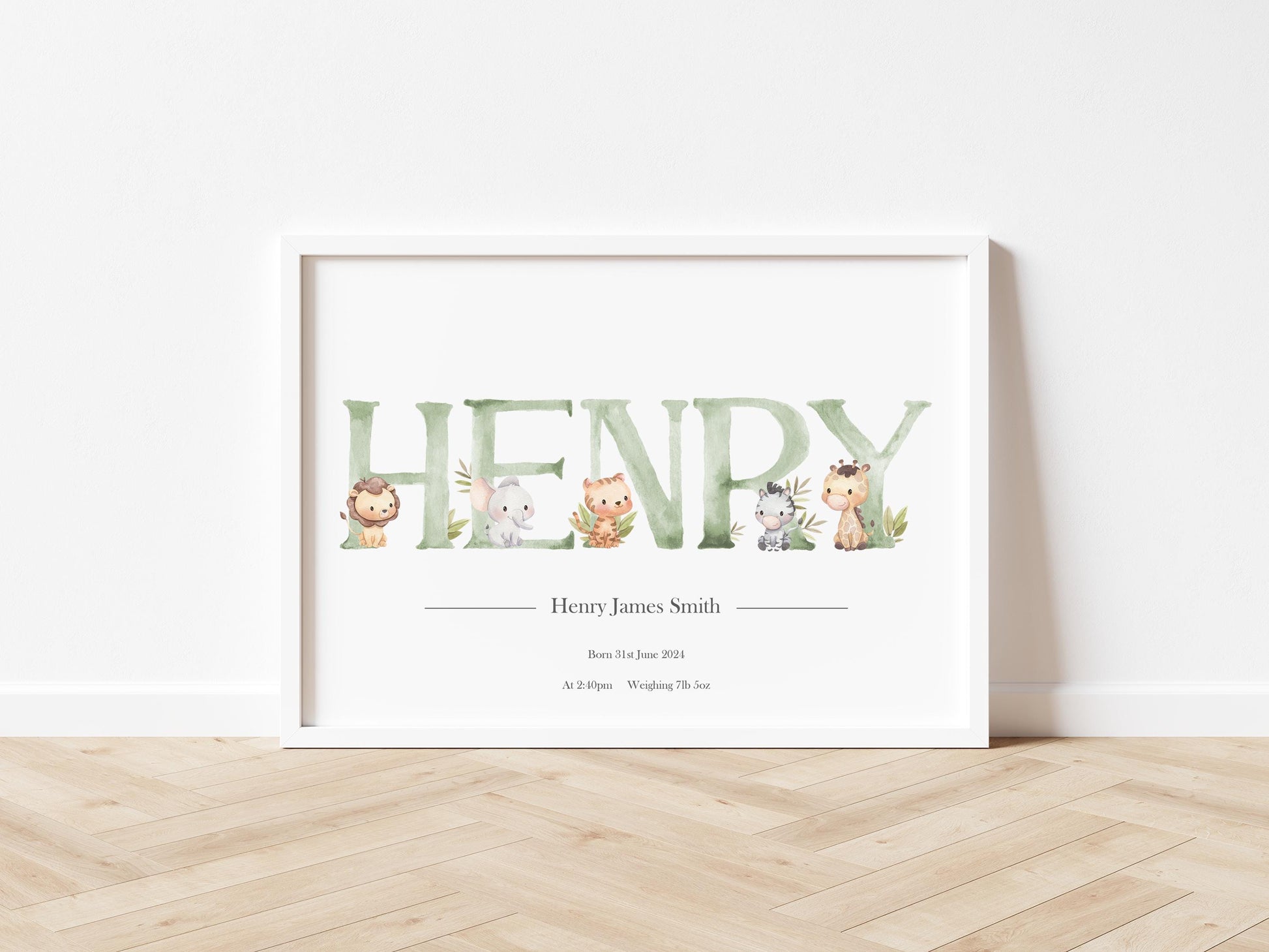 Our personalised A4 baby frame feature a timeless green safari animals design and personalised with your little one's name and birth details. This charming frame allows you to cherish every precious moment.