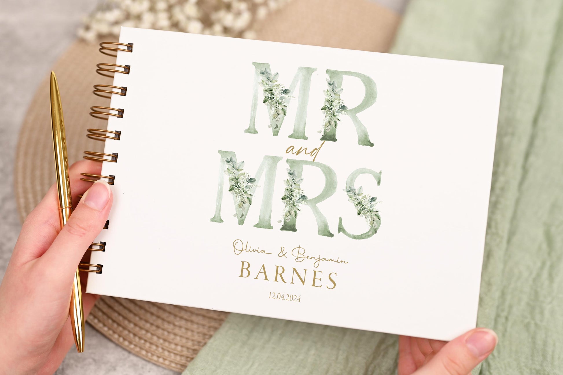 Personalised Wedding Guest Book, High Quality Hand-printed Book, Green Mr & Mrs Modern Wedding Design, Wedding Photo Album