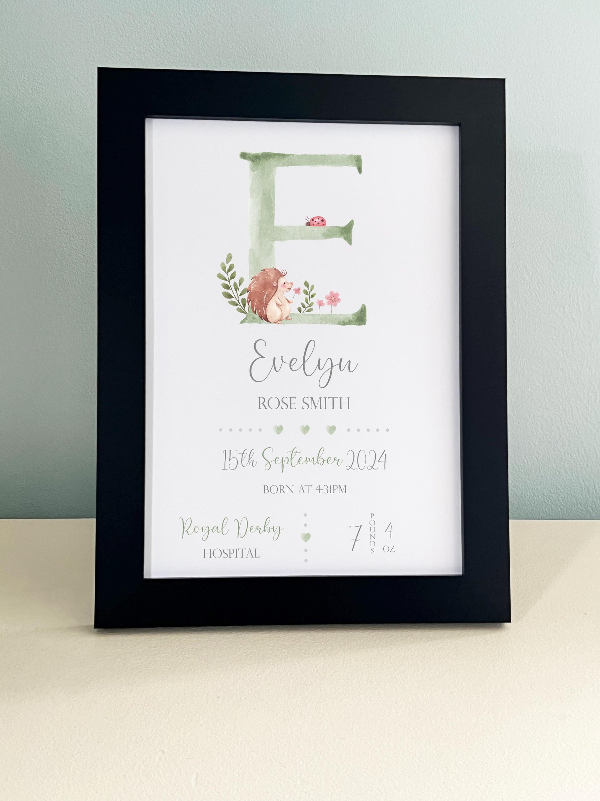 Our personalised A4 baby frame feature a timeless green woodland design and personalised with your little one's name and birth details. This charming frame allows you to cherish every precious moment.