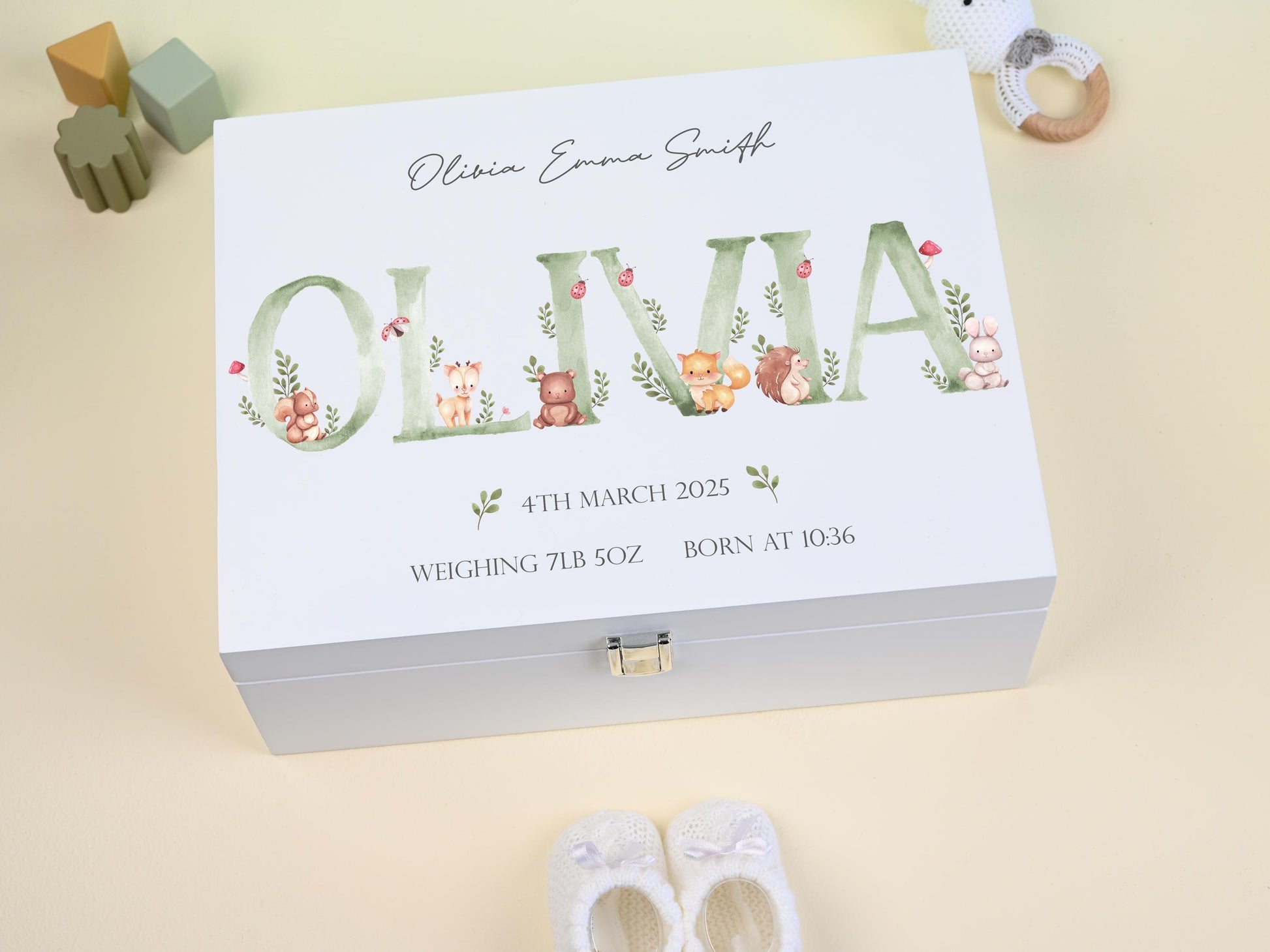 Our baby keepsake box with a timeless Green Woodland Animal design, personalised with your child's name and birth details.